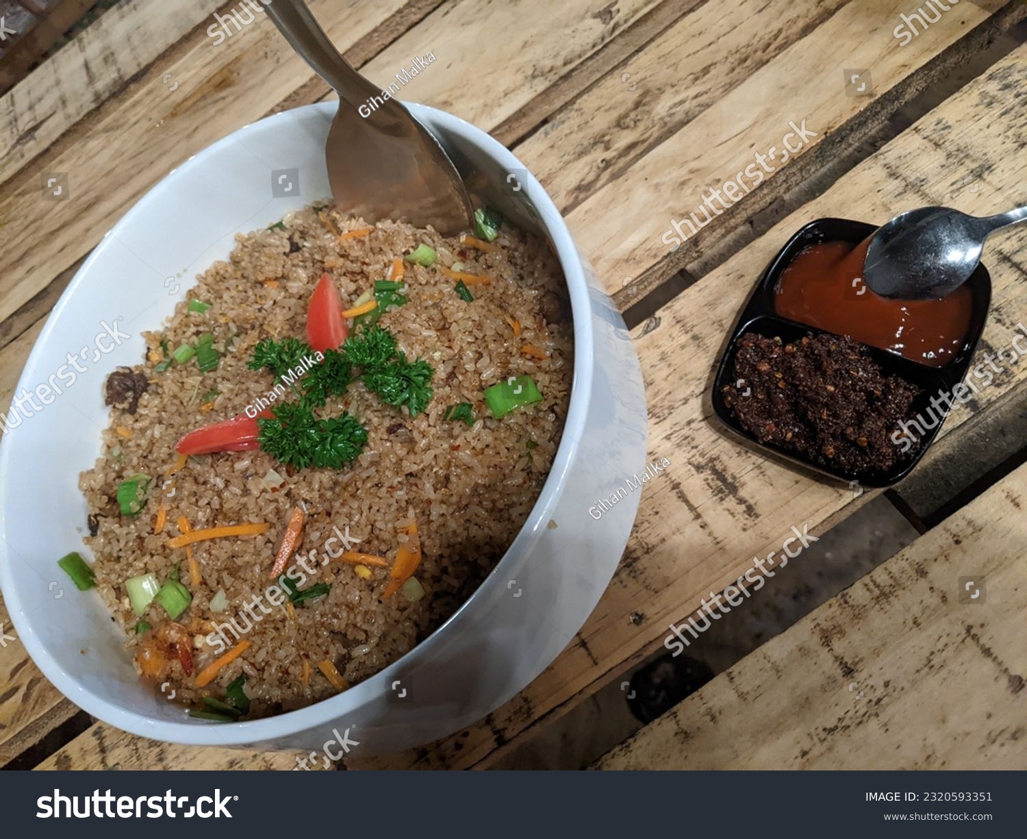 A plate of Mongolian-style rice served appropriately alongside Mongolian-style sauces.